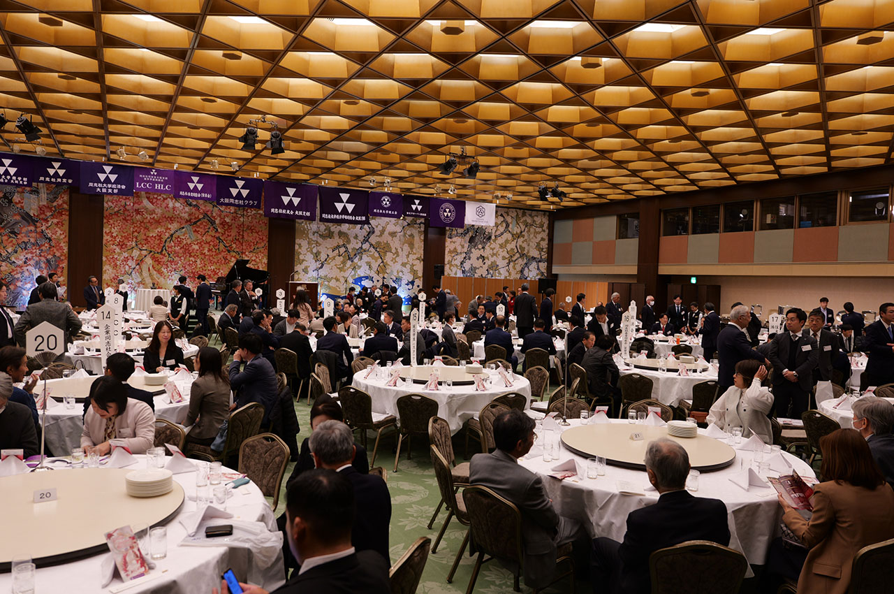 12月3日、リーガロイヤルホテル大阪に約300人が集いました。今年は若手の割安料金を設定し、30歳台以下の参加者が15%近くを占めました。讃美歌、聖書朗読、祈祷で始まり、小原克博学長から同志社創立150周年の思いを込めた挨拶を頂きました。第二部は同志社出身のアーティストによる音楽祭。クラシックに続いてのジャズでは深尾多恵子さんがカレッジソングのジャズアレンジを歌い、聴衆を魅了しました。続くパーティーは松岡敬校友会長の挨拶、八田英二総長・理事長の乾杯でスタート。会場は談笑の輪に包まれ、交流の輪が広がりました。また、現役学生による2025募金隊が回り約14万円が集まりました。應援團チアリーダー部の演舞が会場を盛り上げた後、久保行央支部長から小原学長に150万円の寄付目録を贈呈しました。カレッジソングを歌い、和やかさと活気に包まれるうちに閉会しました。次回夏の総会は7月8日(水)の予定です。